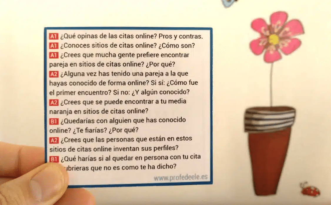 En cuanto a la nivelación de las preguntas para hablar quiero que lo entiendas de una manera flexible. La marca de nivel indica desde qué nivel se podría contestar una pregunta. Si está nivelada como A1, quiere decir que la puede contestar ese nivel y todos los siguientes. Por regla general, se presupone que a más nivel, más productiva va a ser su respuesta. En nuestro mano está el sacarles el máximo juego posible a las preguntas, es decir, que no respondan solo con monosílabos, aunque las preguntas están planteadas para que sean productivas. También, por supuesto, tenemos que ser inteligentes para adaptarnos al nivel, edad e intereses de nuestros estudiantes. Por ejemplo, si tenemos a un estudiante de 12 años delante, no le preguntaremos «¿Cómo era tu escuela?» sino «¿Cómo es tu escuela?» y evitaremos también los temas o las preguntas que se le queden demasiado grandes como por ejemplo si prefiere los pisos de alquiler o una casa comprada.