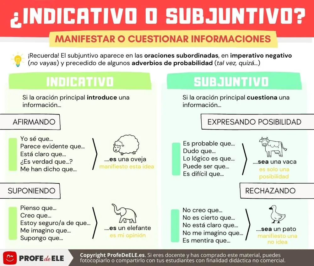 CONTENIDOS: Contraste de indicativo y subjuntivo. Oraciones de sustantivo: afirmar, negar, suponer, valorar un hecho o información. Oraciones causales: justificar una respuesta.