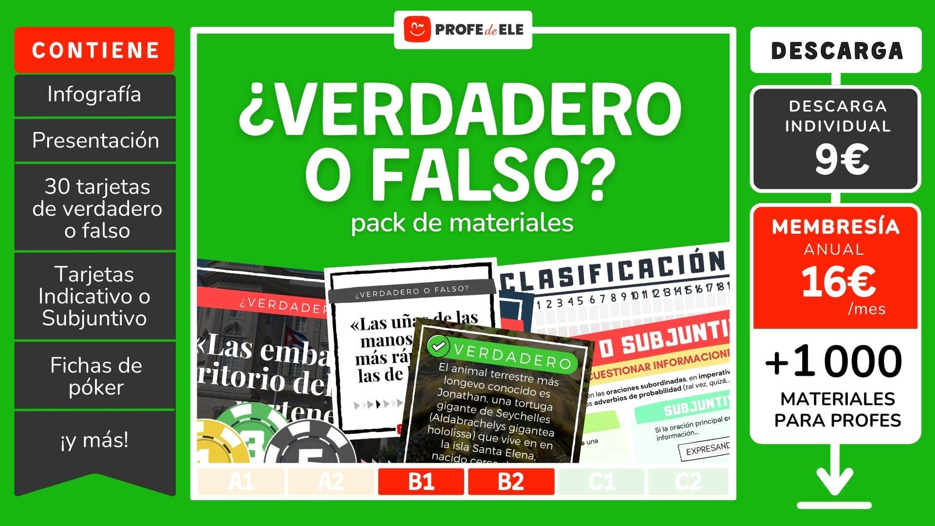 Carmen Martínez, profesora en un instituto de Francia sugiere una revisión de la actividad muy interesante con gran éxito entre sus estudiantes. Se trata de sustituir los items propuestos por otros con contenido sociocultual de la comunidad hispanohablante, tipo: “La grapadora y la fregona son inventos españoles” , “La persona con más títulos nobiliarios del mundo es española” (Verdaderas) o “Pedro Almodóvar tiene un óscar” (Falso, tiene dos)… Y así sucesivamente. ¡Gracias Carmen!