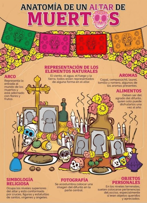 Una excelente manera de que los estudiantes comprendan los componentes que componen un altar de muertos es mediante la creación de una infografía o un mural digital. Utiliza herramientas como Canva, Genially o Piktochart para que los niños, adolescentes y adultos diseñen sus propios trabajos, en los que presenten y expliquen los fundamentos típicos que lo compone, como la flor de cempasúchil, las calaveras de azúcar, las fotografías de los difuntos y el papel picado. Además de desarrollar sus habilidades digitales, esta actividad les permitirá trabajar el vocabulario de la clase de español de una manera significativa y culturalmente relevante.