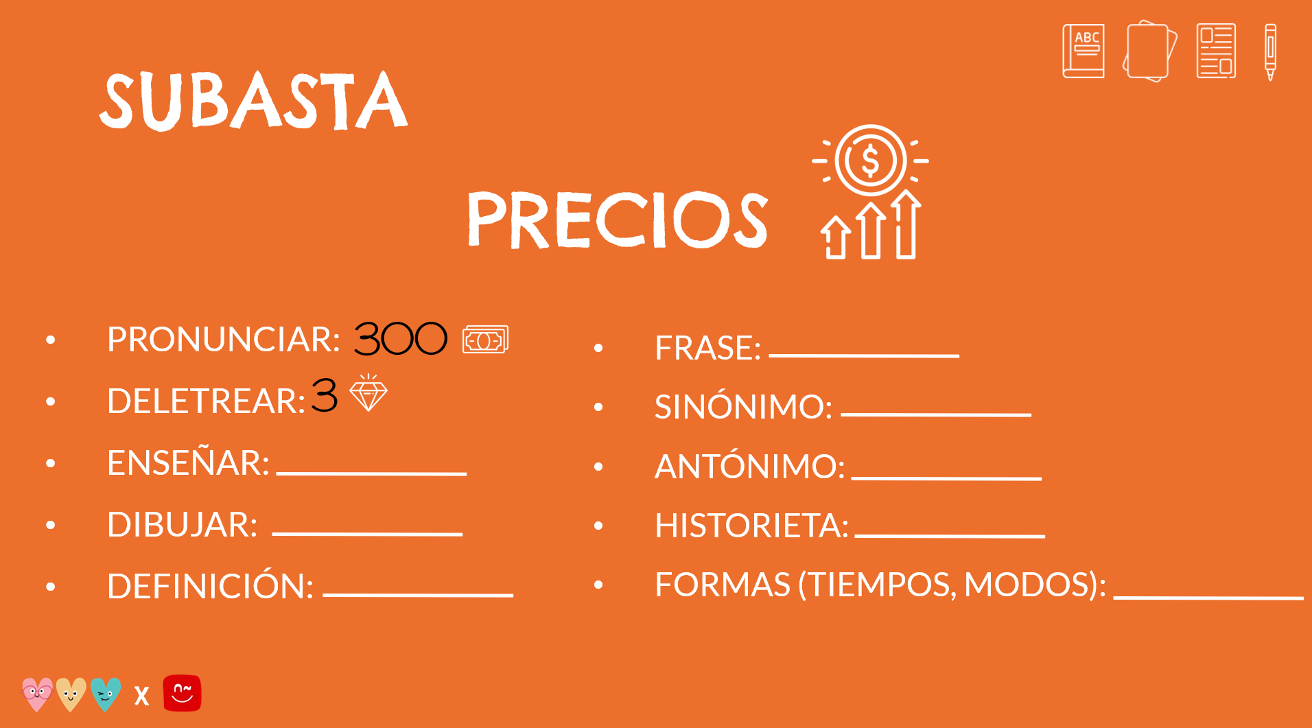 Uno de los juegos sin preparar para la clase de español que podemos utilizar para repasar el material, como el léxico y la gramática, es la subasta. El profesor o los mismos estudiantes tienen que preparar el vocabulario para repasar en forma de fichas pequeñas, y meterlas en un envase tipo una bolsa. Además, será necesario dinero ficticio, pero si no lo tenemos, simplemente diremos las cuotas que los alumnos ganarán. Pero primero necesitamos una lista de acciones que podemos tomar con cada palabra, así que los alumnos tienen que decidir cuánto vale cada actividad que realizarán. En la lista podemos tener las siguientes acciones: